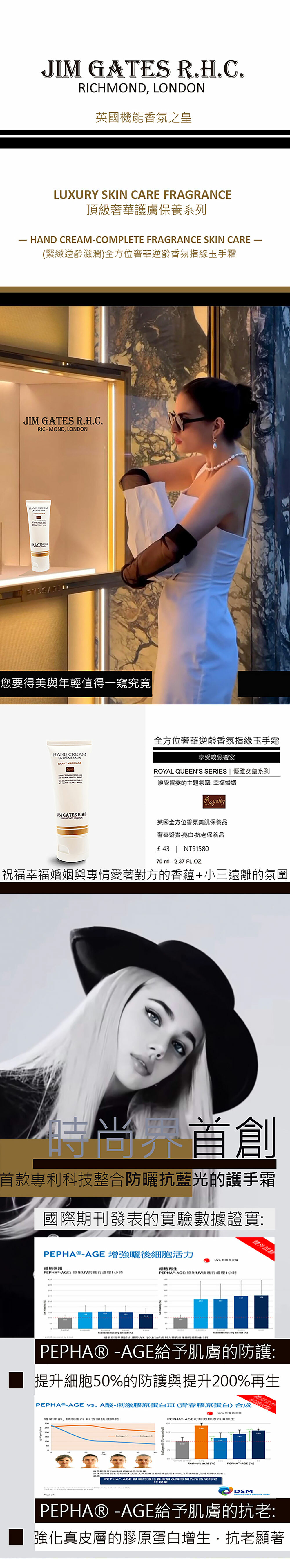 JIM GATES R.H.C.奢華護膚的第一個創新發明讓我們迷戀不已,因為大家口耳相傳最知名且奢華的全方位護手護指緣霜「幸福婚姻」將為我們帶來無比的魅力。我們熱忱邀請女士先生們一起體驗極致的健康呵護,感受我們對卓越的執著。