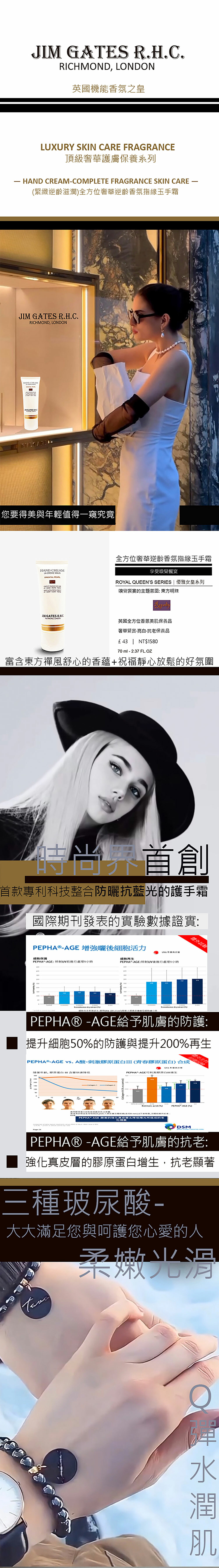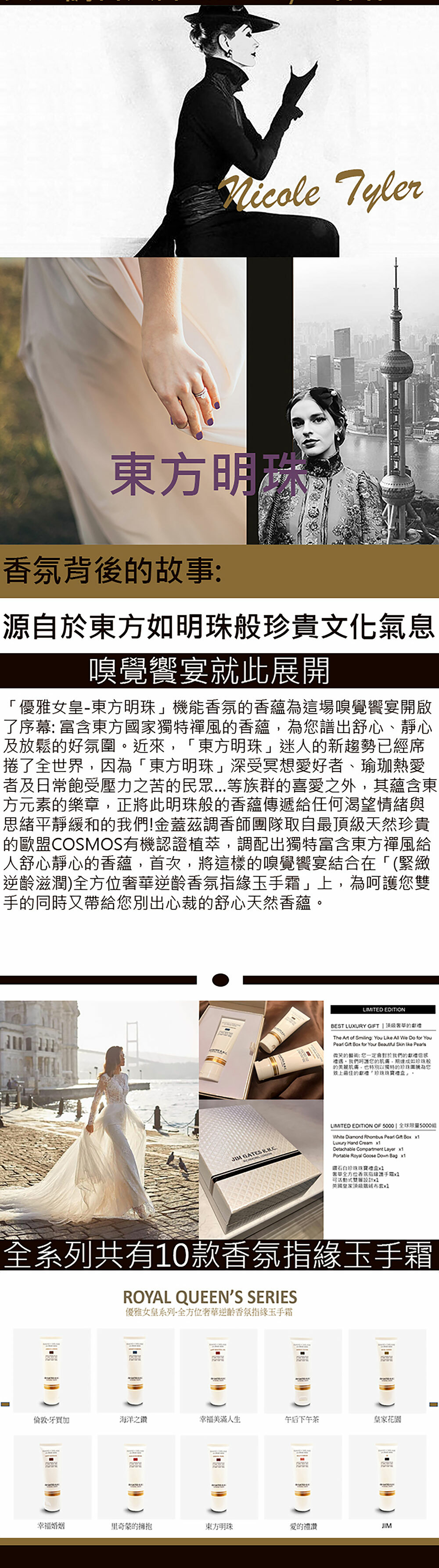 JIM GATES R.H.C.奢華護膚的第一個創新發明讓我們迷戀不已,因為大家口耳相傳最知名且奢華的全方位護手護指緣霜「東方明珠」將為我們帶來無比的魅力。我們熱忱邀請女士先生們一起體驗極致的健康呵護,感受我們對卓越的執著。
