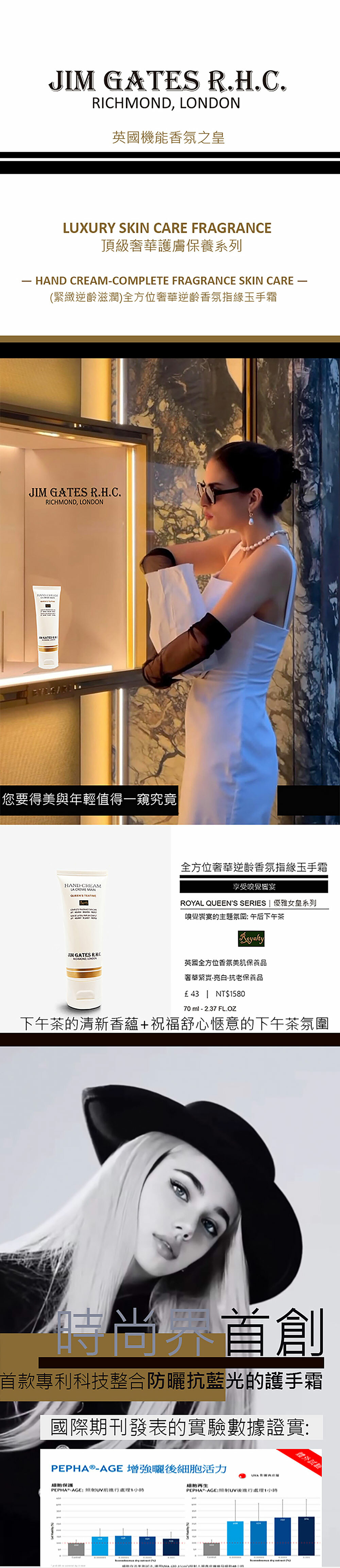 JIM GATES R.H.C.奢華護膚的第一個創新發明讓我們迷戀不已,因為大家口耳相傳最知名且奢華的全方位護手護指緣霜「午后下午茶」將為我們帶來無比的魅力。我們熱忱邀請女士先生們一起體驗極致的健康呵護,感受我們對卓越的執著。