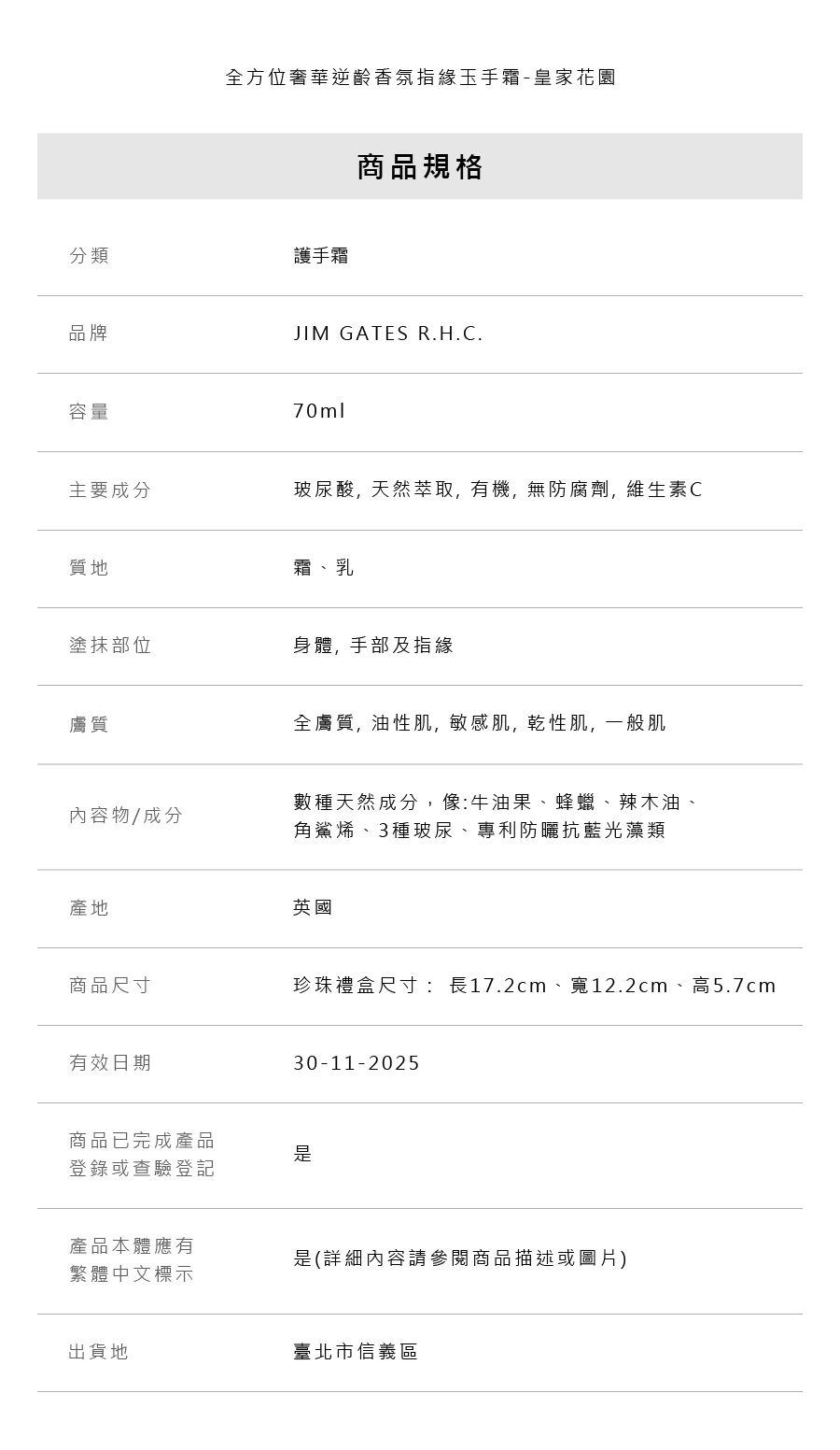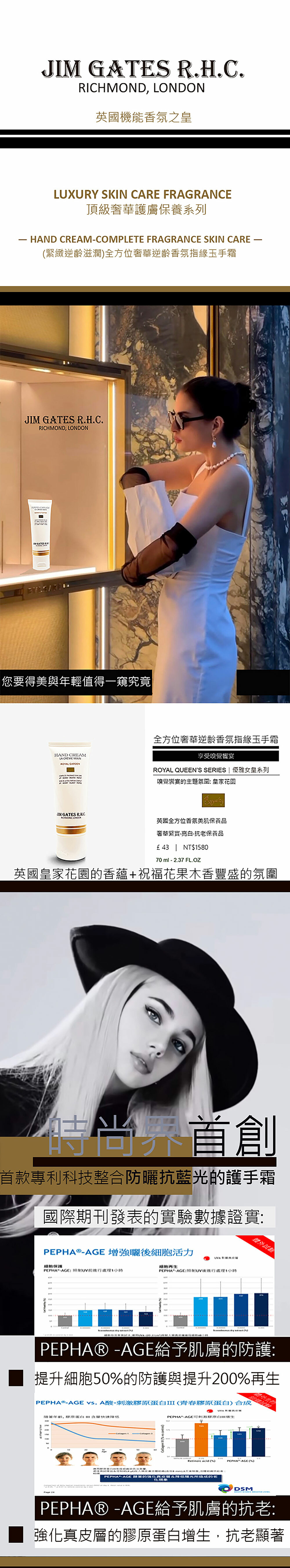 JIM GATES R.H.C.奢華護膚的第一個創新發明讓我們迷戀不已,因為大家口耳相傳最知名且奢華的全方位護手護指緣霜「皇家花園」將為我們帶來無比的魅力。我們熱忱邀請女士先生們一起體驗極致的健康呵護,感受我們對卓越的執著。